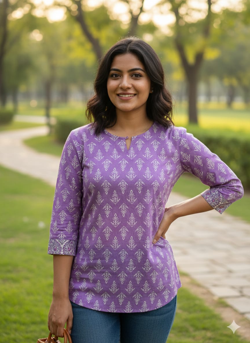 Add effortless ethnic charm to your everyday wardrobe with our Hand Block Printed Cotton Top,...