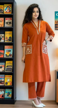 Rust Orange Embroidered Cotton Kurta Set