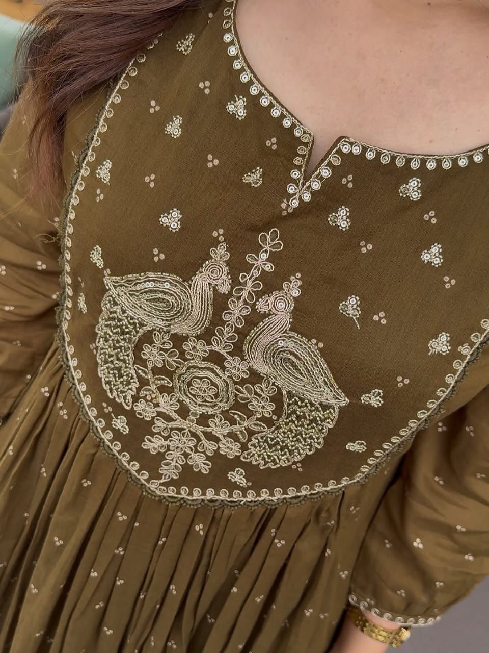 - A-line Kurti with embroidered yoke and detailed sleeves for a refined look