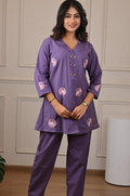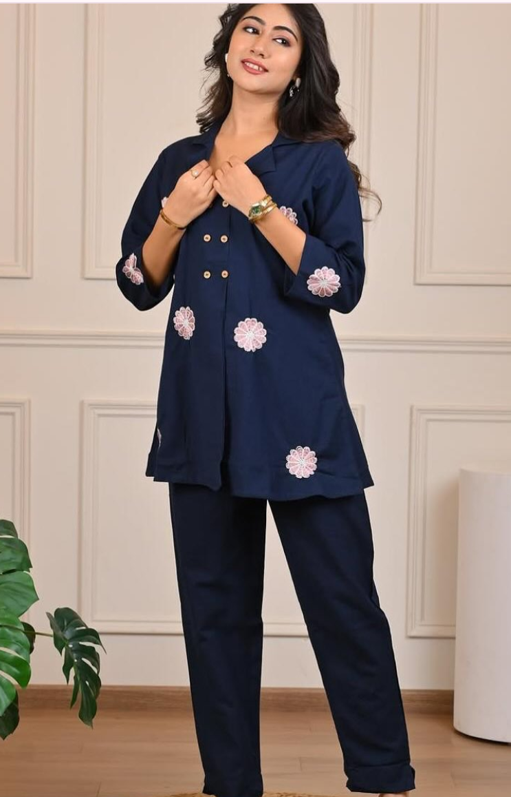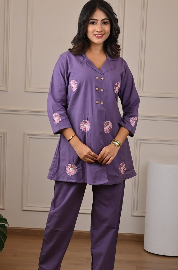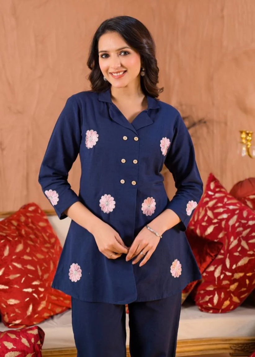 Crafted from soft and breathable cotton slub fabric, this set ensures all-day comfort while maintaining a refined silhouette. The coordinated embroidered pants complete the outfit perfectly—ideal for festive wear, work days, or elegant casual outings.