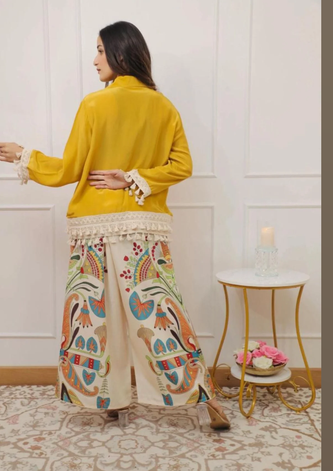 Paired with a contrast digital print divider and a matching pure cotton palazzo, this set offers a coordinated, graceful look ideal for festive occasions, gatherings, or casual celebrations.