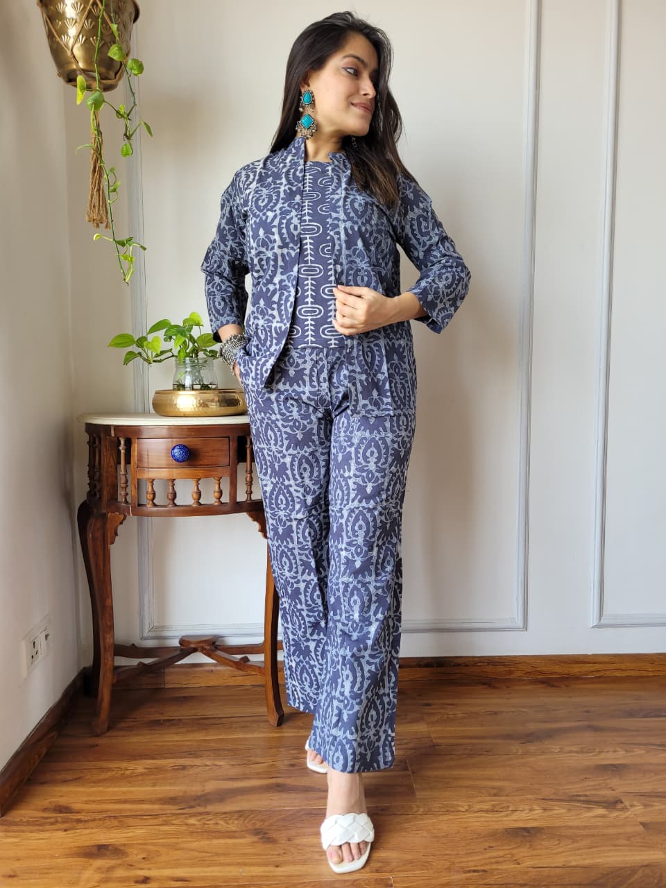 Blueish Grey Hand Block 3PC Cotton Co-ord Set
