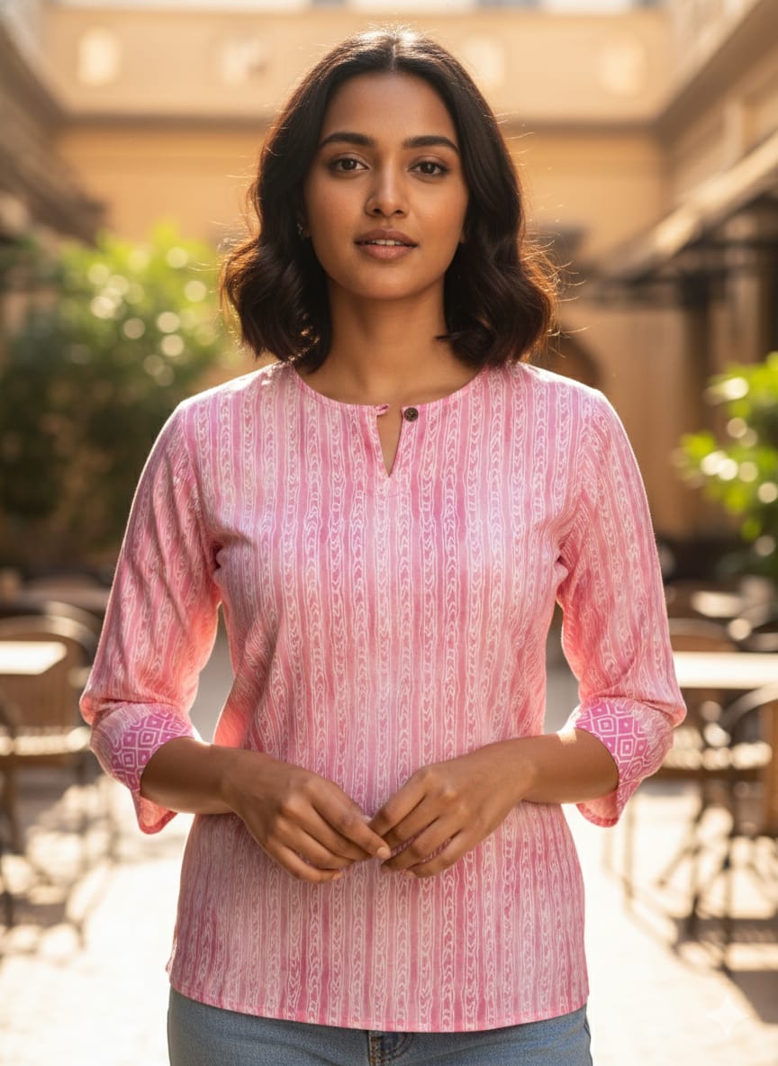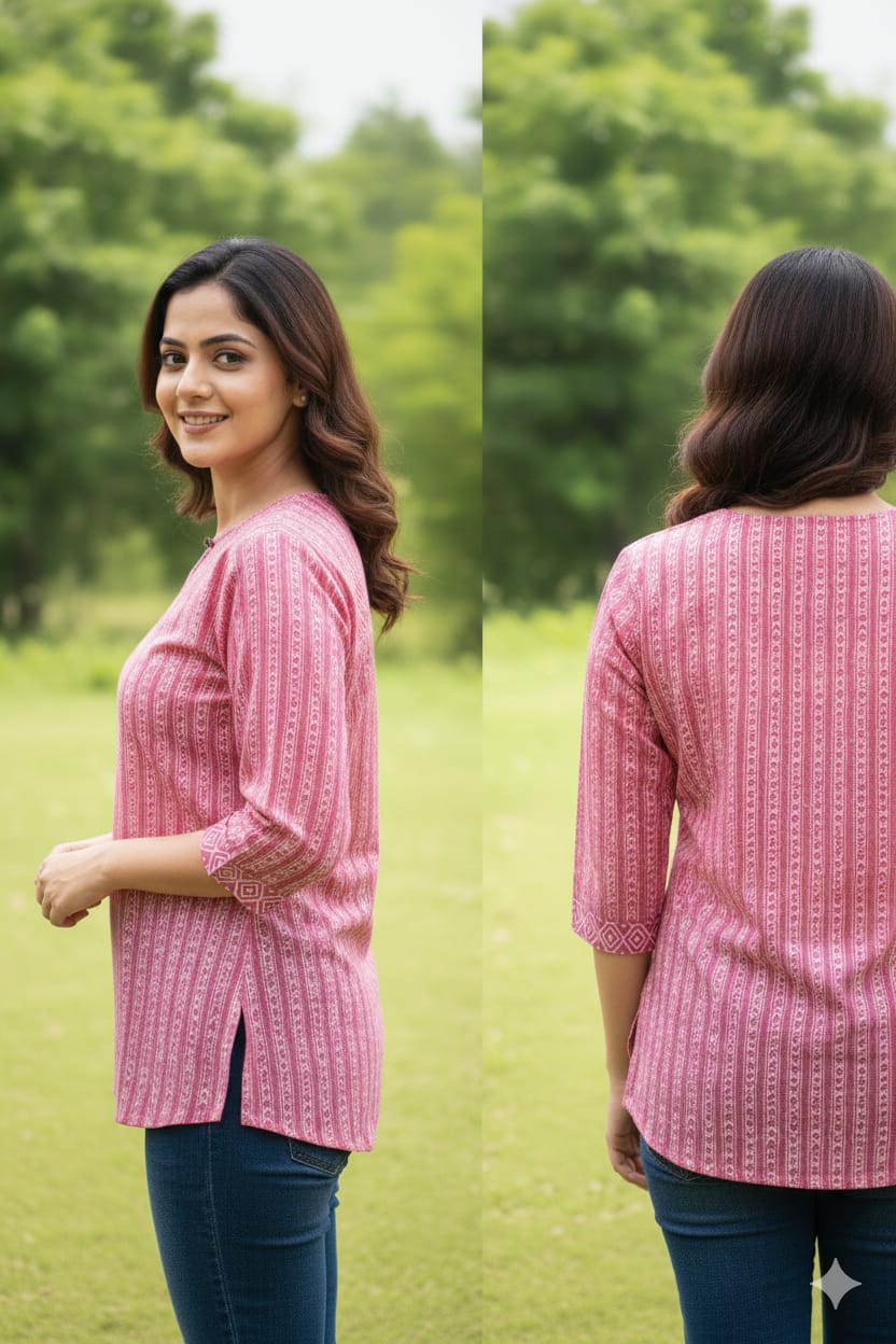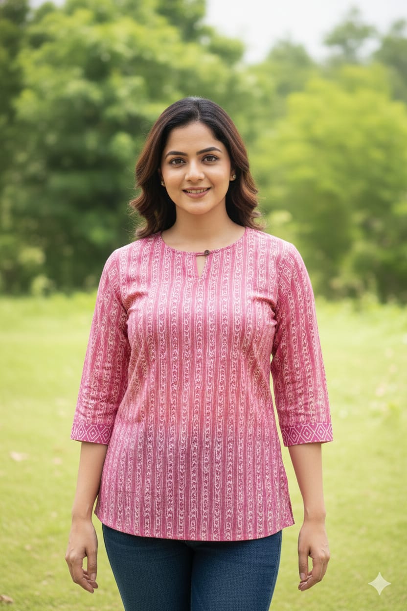 Add effortless ethnic charm to your everyday wardrobe with our Hand Block Printed Cotton Top, crafted using traditional Bagru printing techniques. Made from breathable pure cotton, this top is designed for all-day comfort, making it perfect for office wear, daily outings, and college wear.