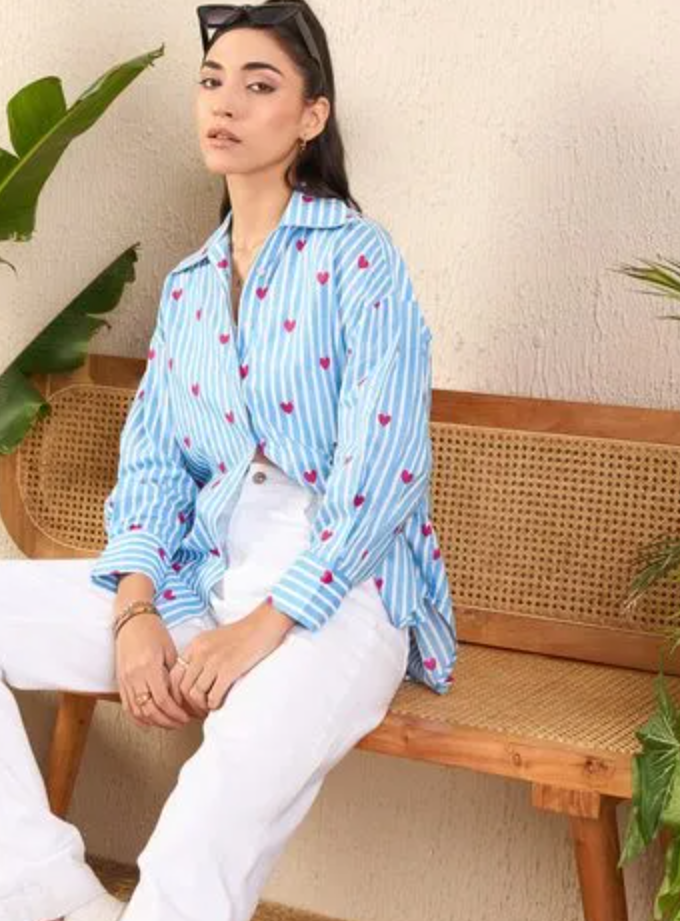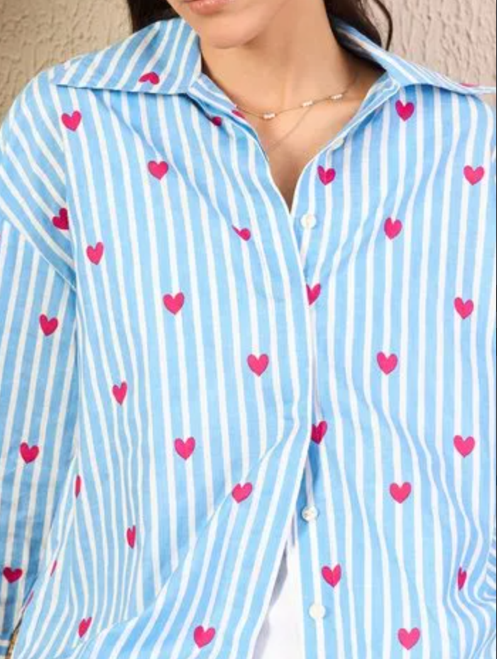 Redefine everyday elegance with our Heart Printed Asymmetrical Cotton Shirt — a perfect blend of comfort, versatility, and modern design.