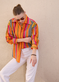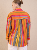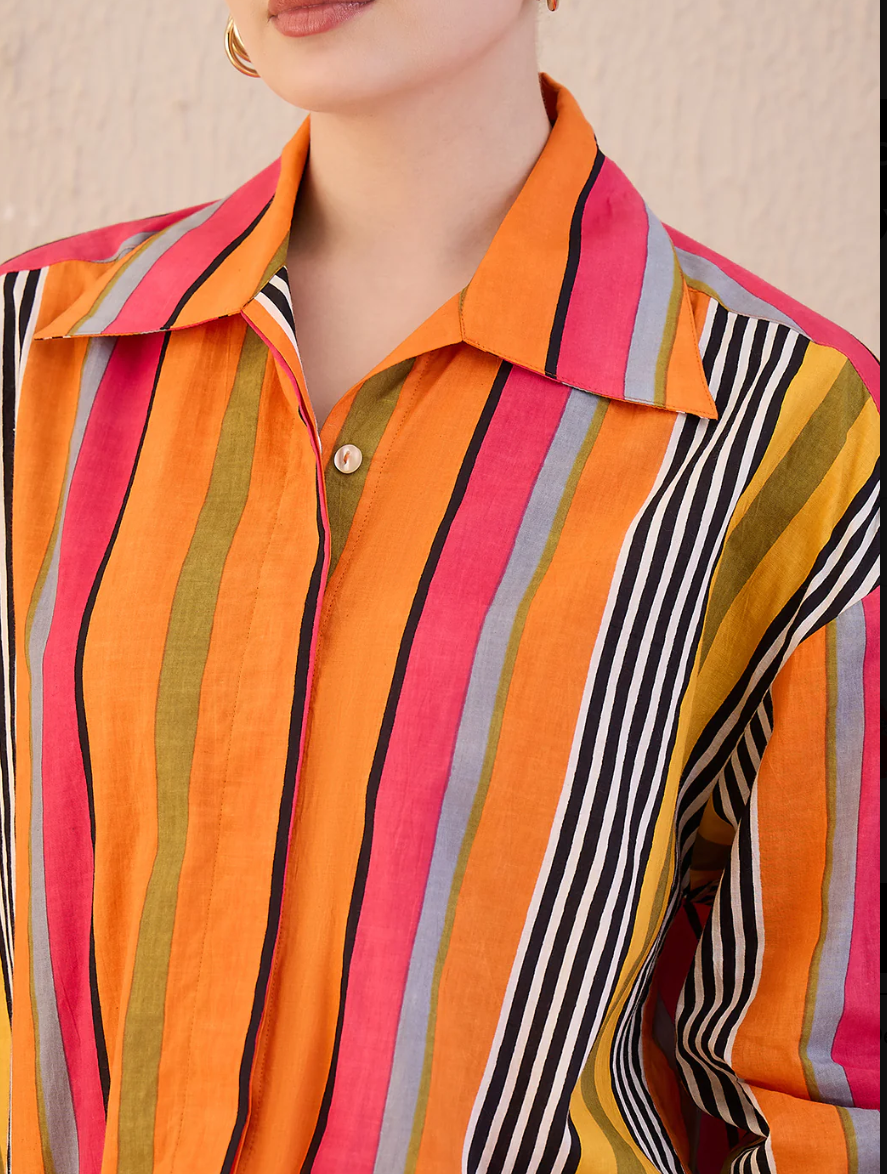 Add a splash of colour and style to your wardrobe with our Printed Asymmetrical Cotton Shirt, featuring eye-catching multi-coloured stripes for a playful yet elegant touch.
