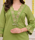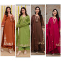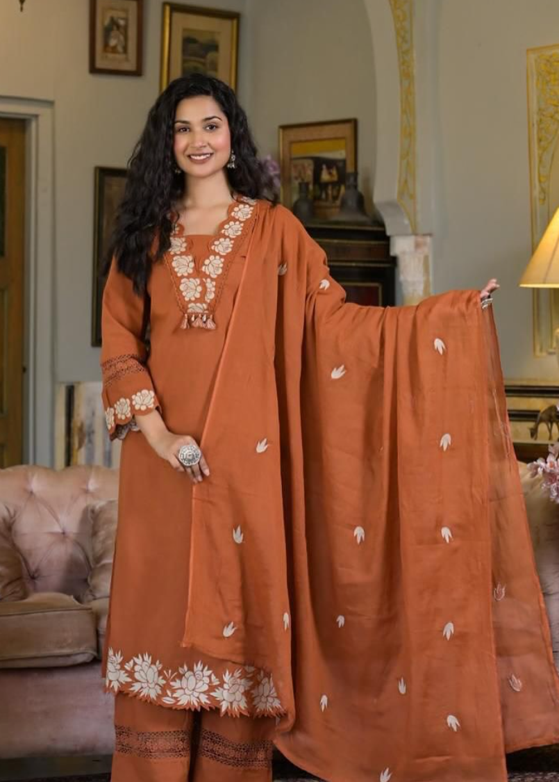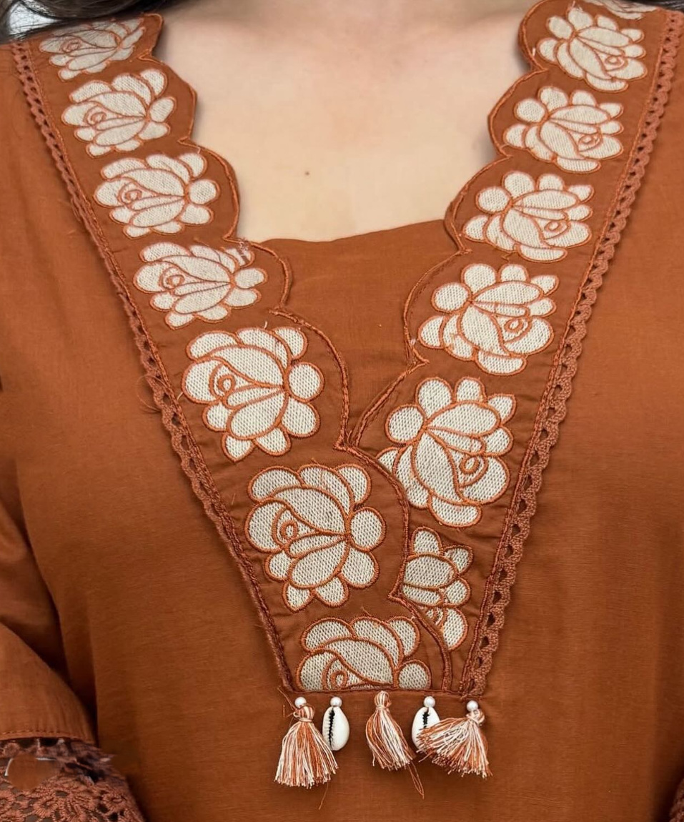 Upgrade your festive and party wardrobe with our Embroidered Cotton Kurti Pant Dupatta Set, crafted in premium 60x60 Taj Cotton fabric. This elegant straight kurta set for women is designed with delicate embroidery, hand-cut details, and crochet lace finishes for a refined ethnic look.