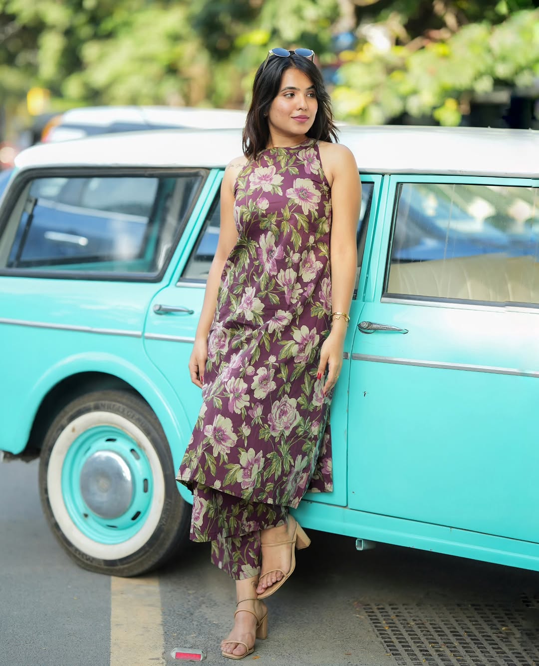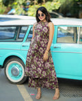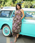 Crafted in breathable cotton fabric, the set features a halter neck A-line kurta with both-side pockets, paired with a relaxed palazzo for effortless movement. The intricate print work adds a festive touch, making it perfect for pujas, family gatherings, and auspicious occasions.
