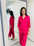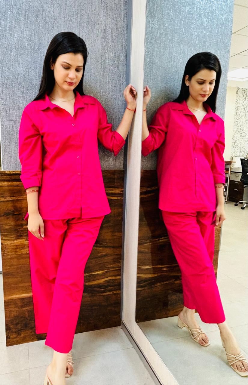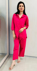 Level up your Cotton Two-piece Co-Ord set! The set features a pant and an open collared shirt with buttons. The pant has a soft elastic at the back for a great fit.